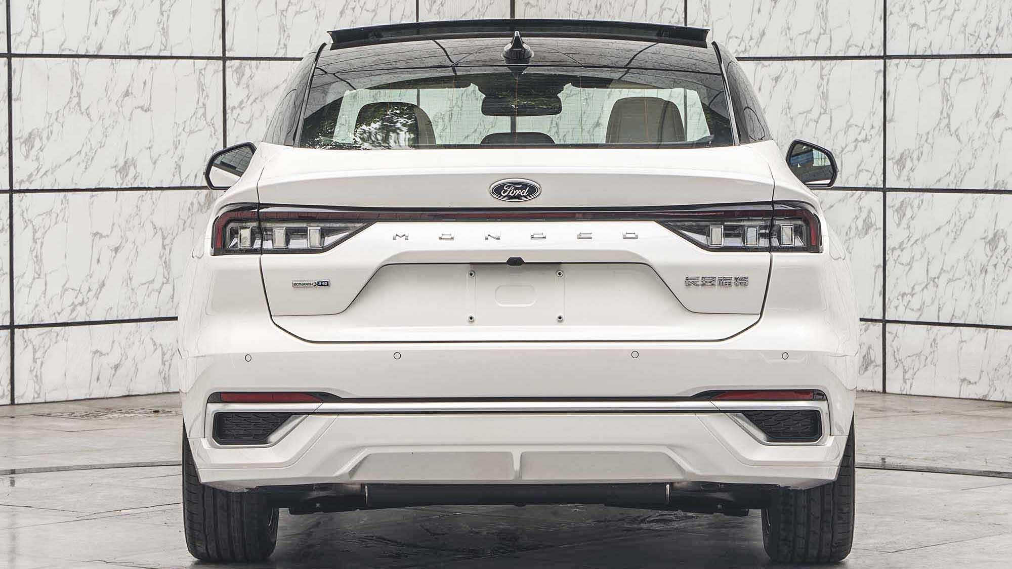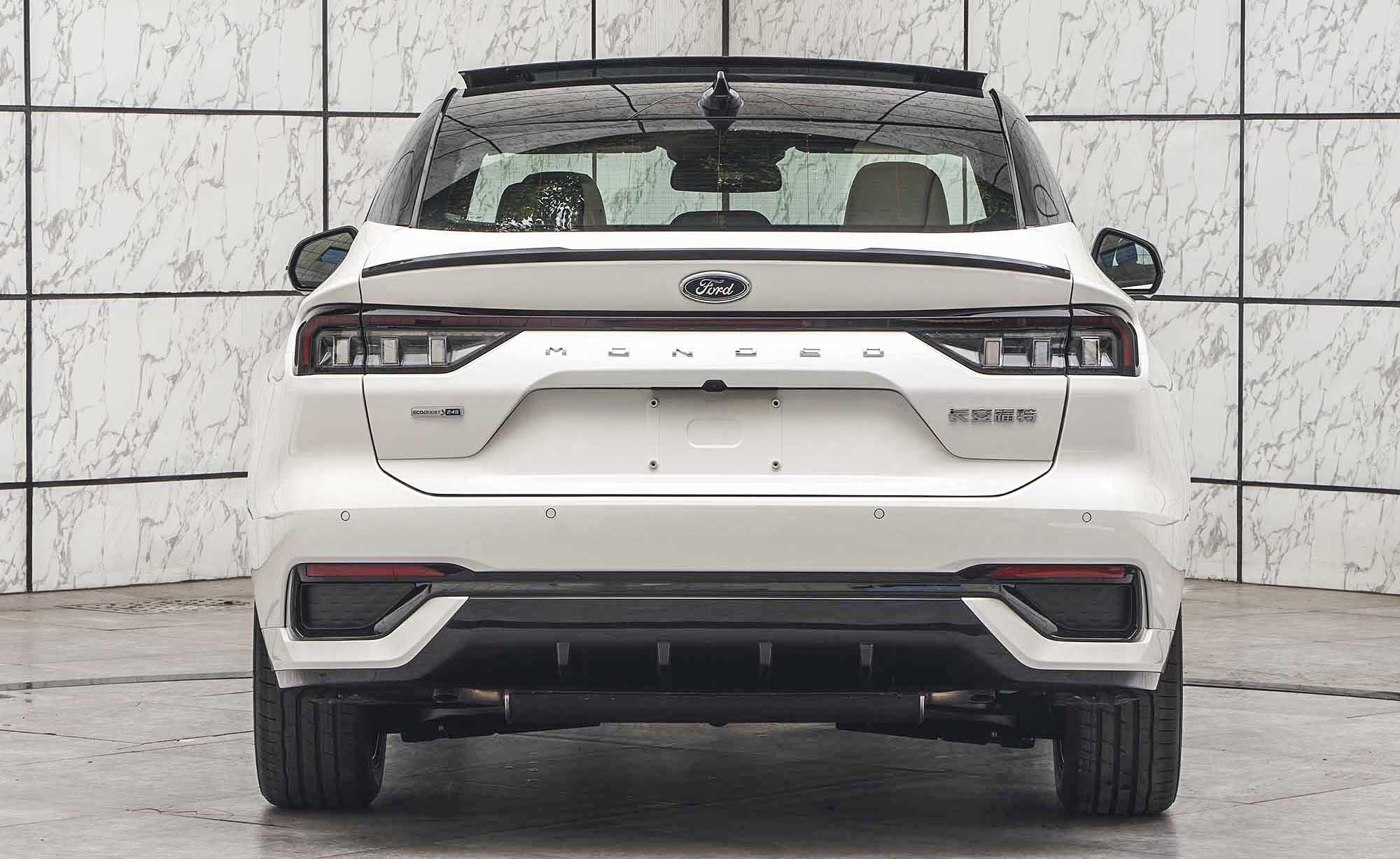 全新蒙迪欧的车尾非常有层次感,纯黑的车顶与车身做出视觉分割,后备箱上沿有一个黑色的小鸭尾装饰,中间是熏黑的贯穿式尾灯,下方还有熏黑的运动化扩散器。不过全新蒙迪欧的排气采用了隐藏式设计,看起来在气势上稍弱一些。不出意外的话,这应该是带有ST-Line运动套件的版本。