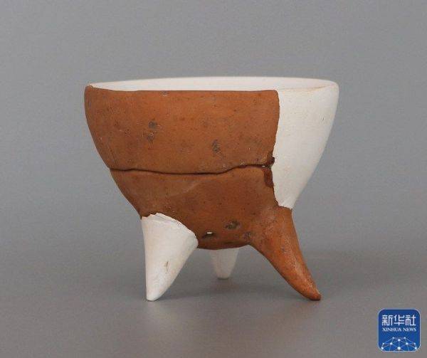 这是在位于河南省新郑市的裴李岗遗址出土的炊具鼎(资料照片)。新华社发(中国社会科学院考古研究所供图)