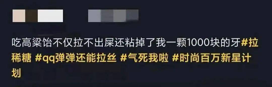 不少人入了一堆“高粱饴”后发现事情并不简单:“有点齁”“糖精味儿”只是基本评价,“费嗓、费牙、费脑门”已经有点伤害了,有的人还被高粱饴粘掉1000块钱的牙。
