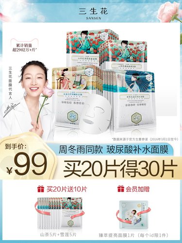 百雀羚三生花玻尿酸面膜20片售价99元,叠加10元优惠券后89元包邮,送10片。