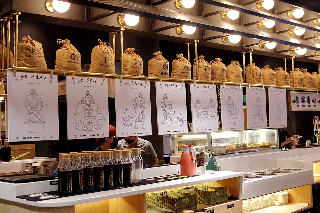 一进门就能感觉到空气中有明显的香料味,既有这里主打的卤水火锅沸腾带来的烟火气,又有从成列架上各种各样香料麻包中散发出来的香氛。