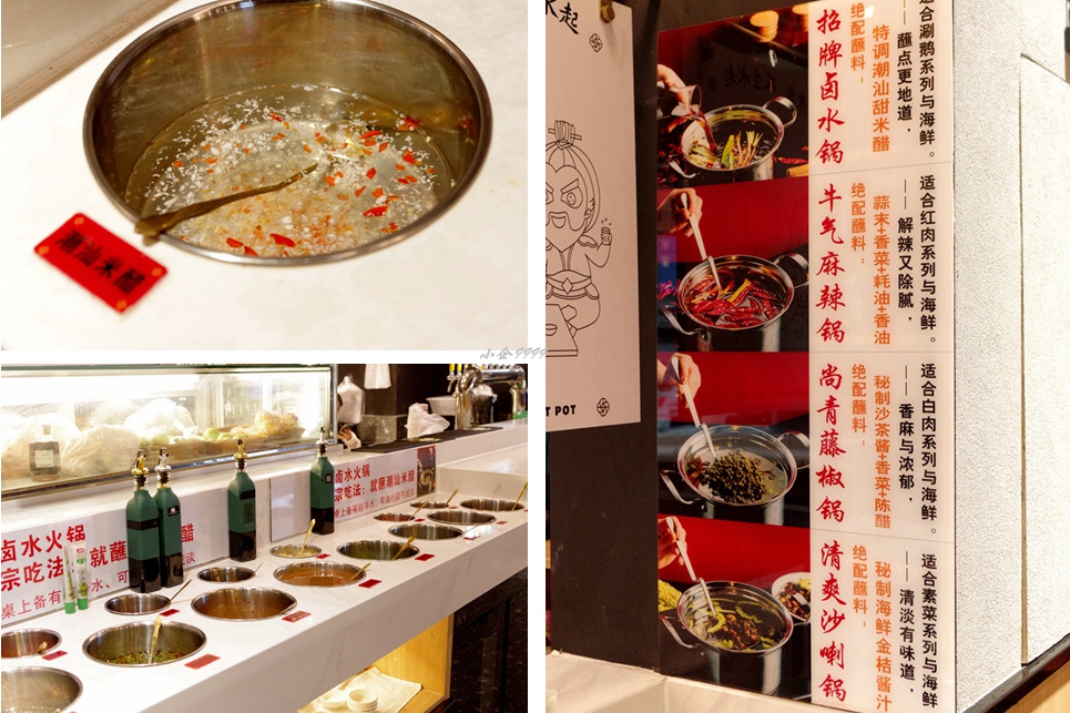 锅底口味有四种,分别是招牌卤水、牛气麻辣、尙青藤椒、清爽沙喇。调味区有醒目地提示:卤水锅适合搭配潮汕米醋蘸食才最正宗;涮食牛肉需搭配沙茶酱。
