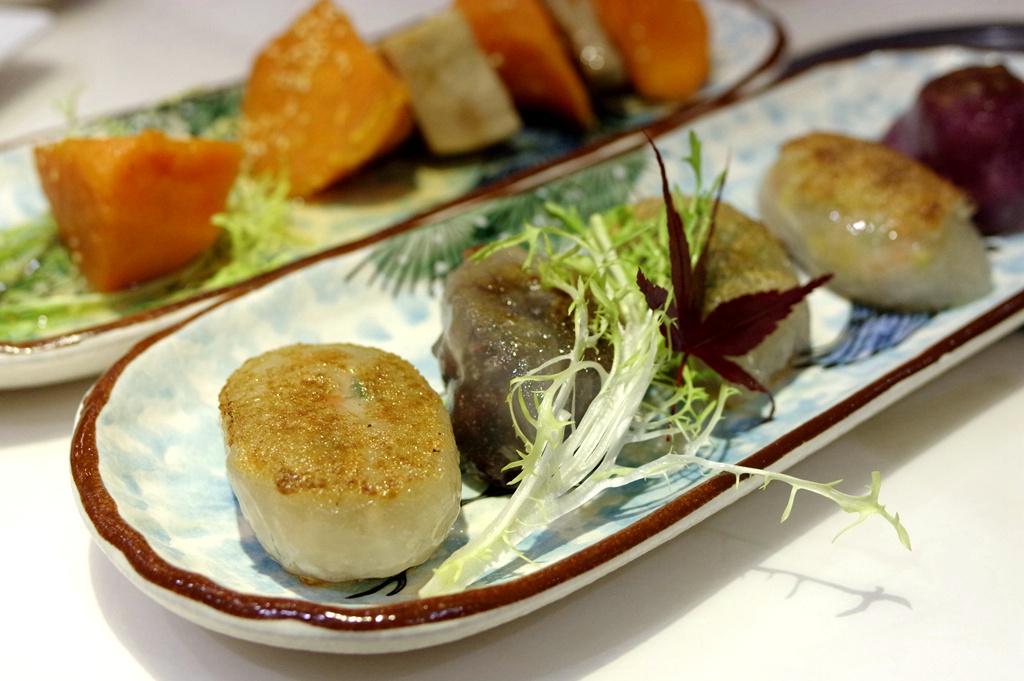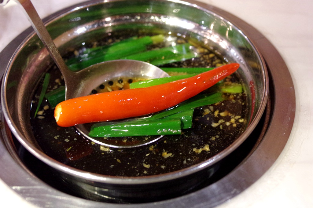 蘸米醋碟吃起来比较爽口,因此这两种质地爽脆的更凸显长处。如果觉得偏淡就跟我一样,先蘸醋,再蘸辣味碟。