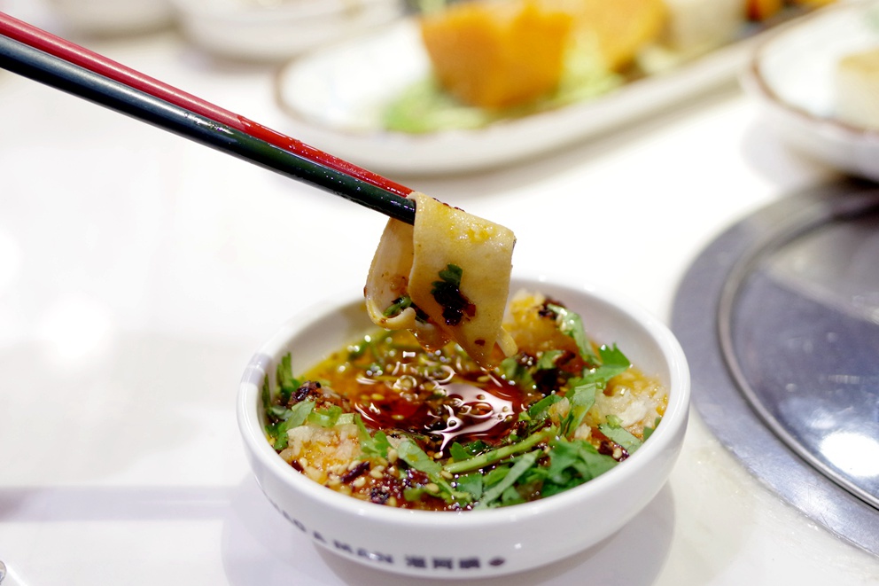 米醋碟用来蘸内脏类食材、沙茶酱用来对付牛肉,至于比较清淡的素菜或菌菇,还是蒜蓉辣椒才过瘾。像这样的蘸碟搭配,比起吃其他类型的火锅时我一味辣味打天下区别还是相当明显哪!