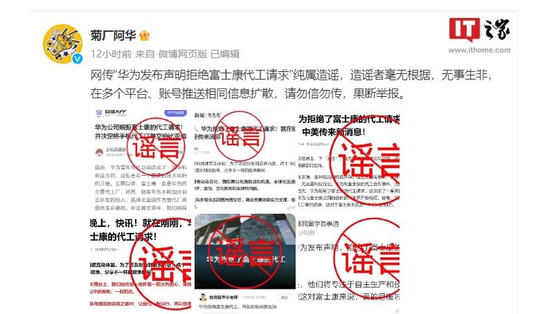 10月8日晚间,华为技术有限公司通过其官方微博发布声明:网传“华为发布声明拒绝富士康代工请求”纯属造谣,造谣者毫无根据,无事生非,在多个平台、账号推送相同信息扩散,请勿信勿传,果断举报。