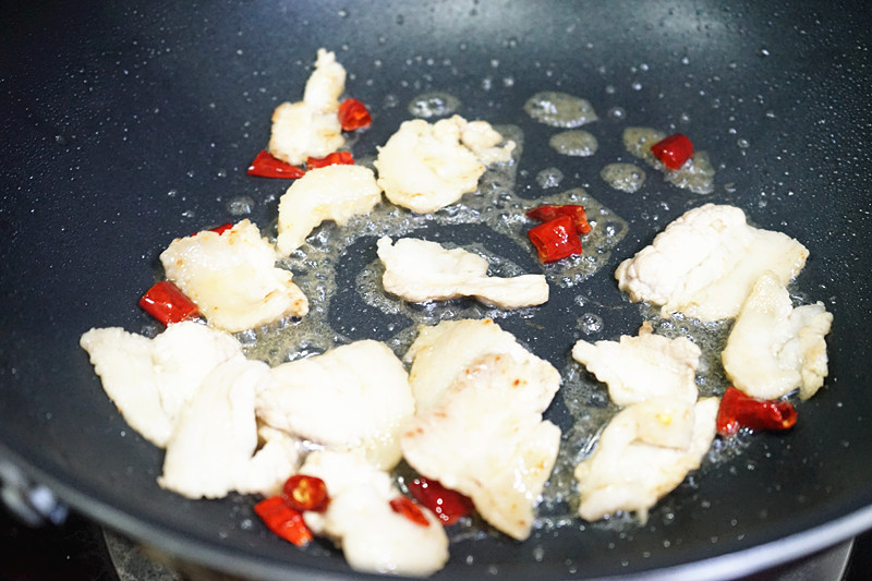 3、炒锅里面倒入适量的油,先把猪肉片炒一下,将猪肉馅煸炒一下,等到猪肉表面有点发黄微焦之后下干辣椒。