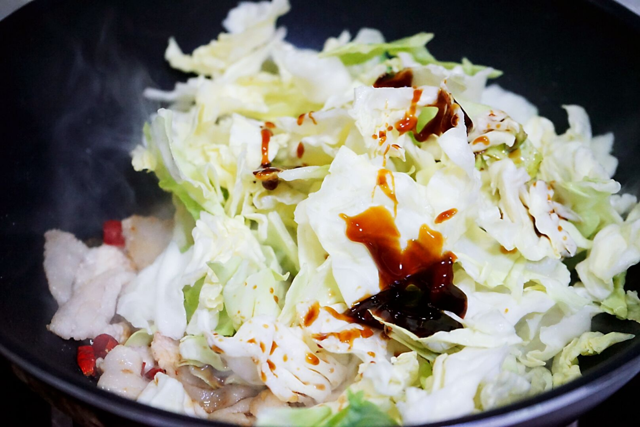 6、大火翻炒将包菜炒香,最后调入盐和一小撮糖,注意包菜不要炒太久,颜色变深之后再炒几下就可以关火了。