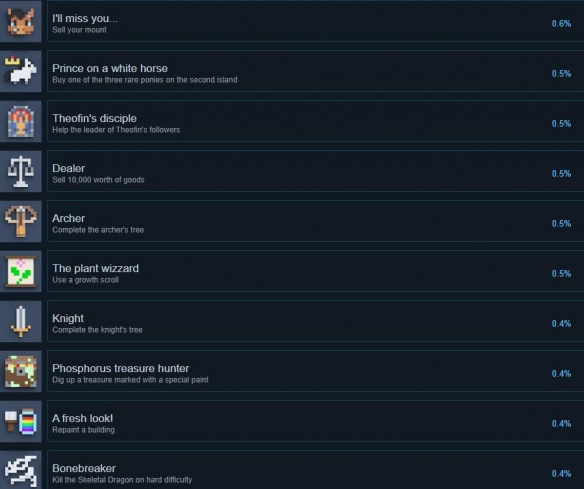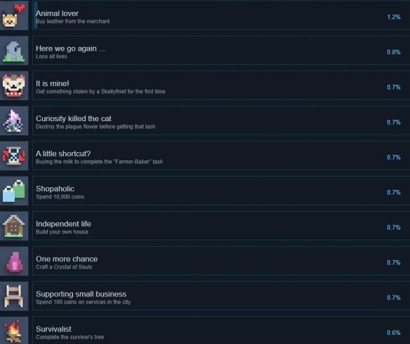 幻想之地是像素生存rpg游戏新作,已于今天正式上线,到目前steam的整体评价还是不过的,游戏成就共有47项需要玩家去收集,来看下都有哪些成就吧。