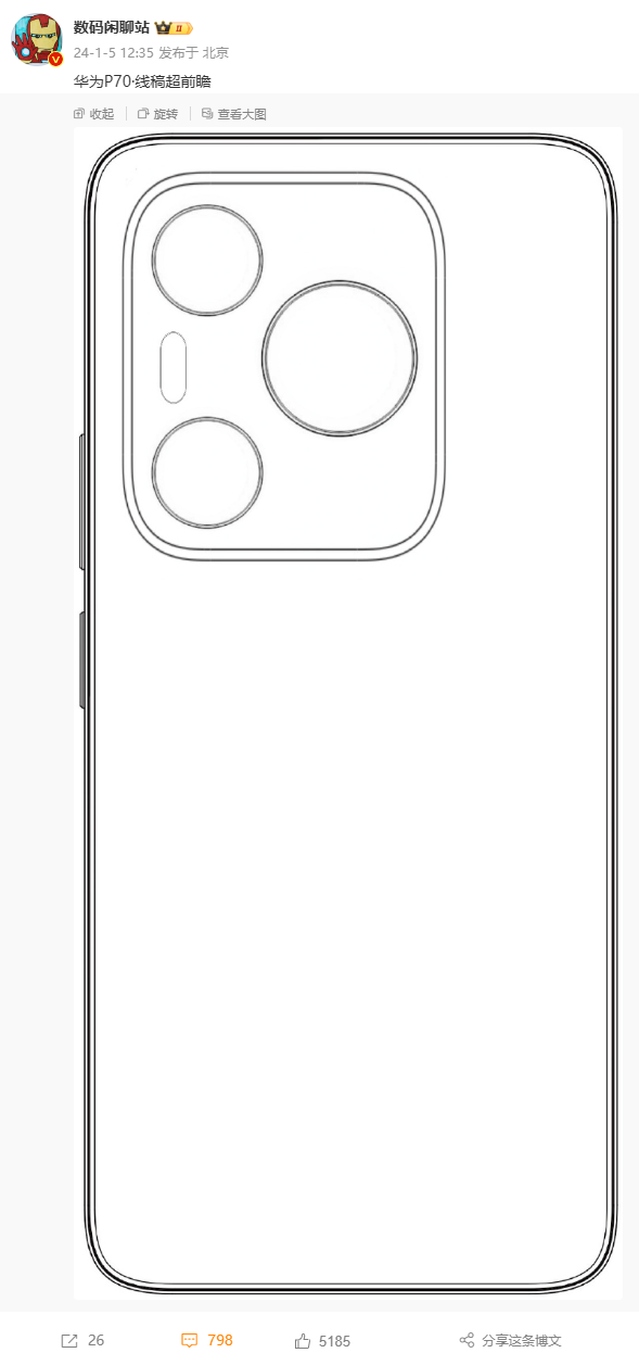 博主 @数码闲聊站在微博分享一张华为 P70 超前瞻线稿,展示了这款新机的背部外观。