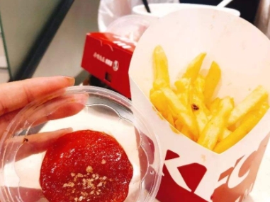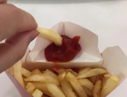 很多人都是这样做的,可是呢,大家知道不知道番茄酱可以放在一个更好的地方,即使没有盘子也能很好的利用起来,因为薯条盒子上有一个小机关,这里面就可以放番茄酱。其实呢,很多人把番茄酱挤在餐巾纸上,这样是很不卫生的,番茄酱挤在餐巾纸上吃对我们的健康造成了隐患。