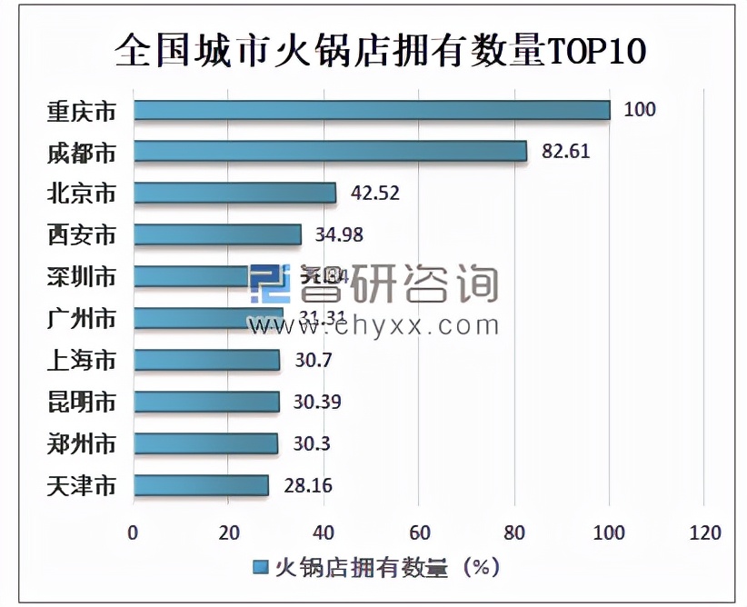 根据智研咨询发布的《2021-2027年中国火锅店行业市场研究分析及投资战略规划报告》数据显示,截至2020年12月,全国城市火锅店拥有数量排名中,重庆位列全国第一。目前重庆火锅在全国的门店已经突破150000家,其中重庆本地的火锅店约有30000家。