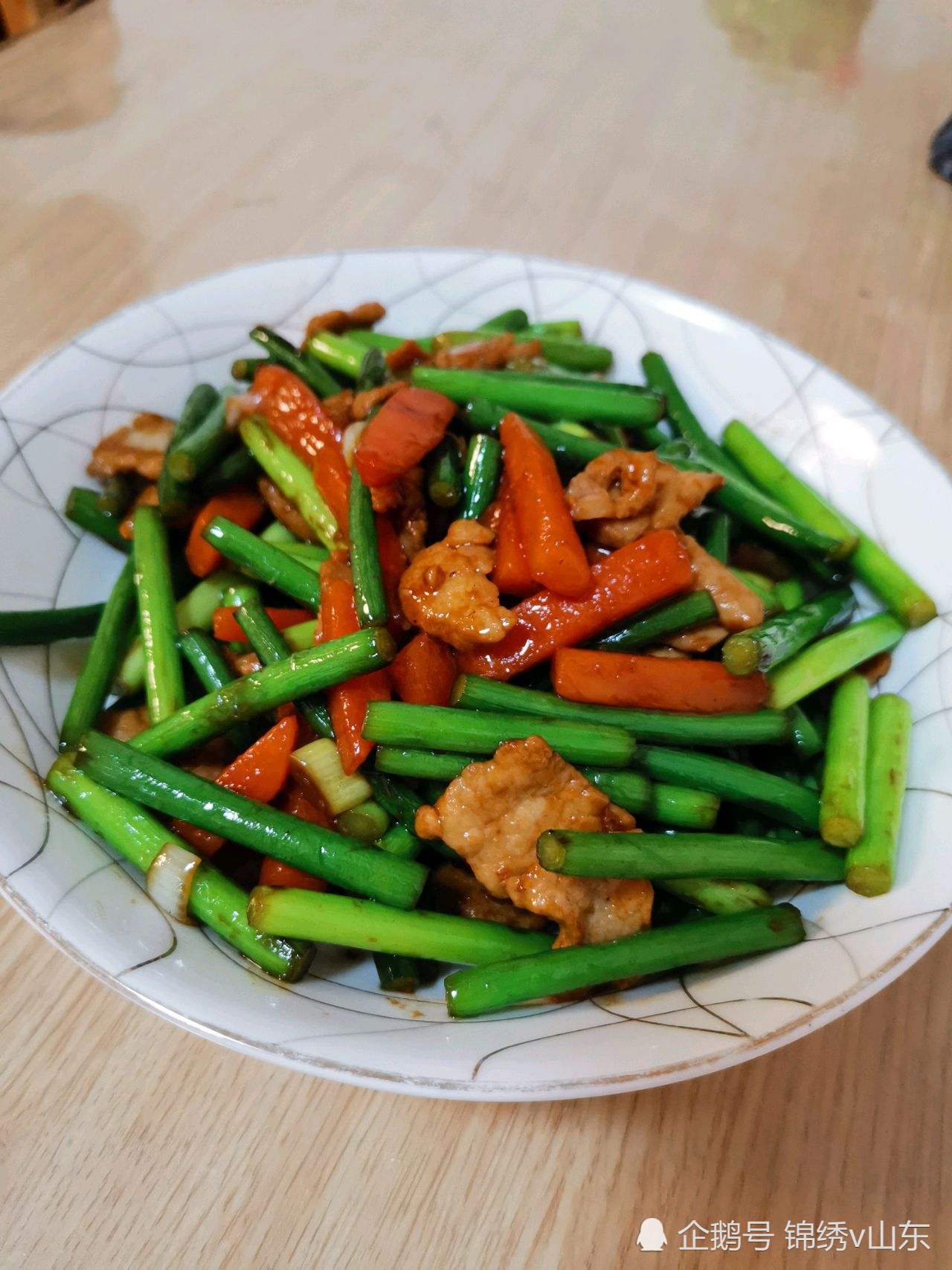 食材:蒜苗一把、肉丝三两、葱姜、料酒、干辣椒、生抽、盐、糖、生粉